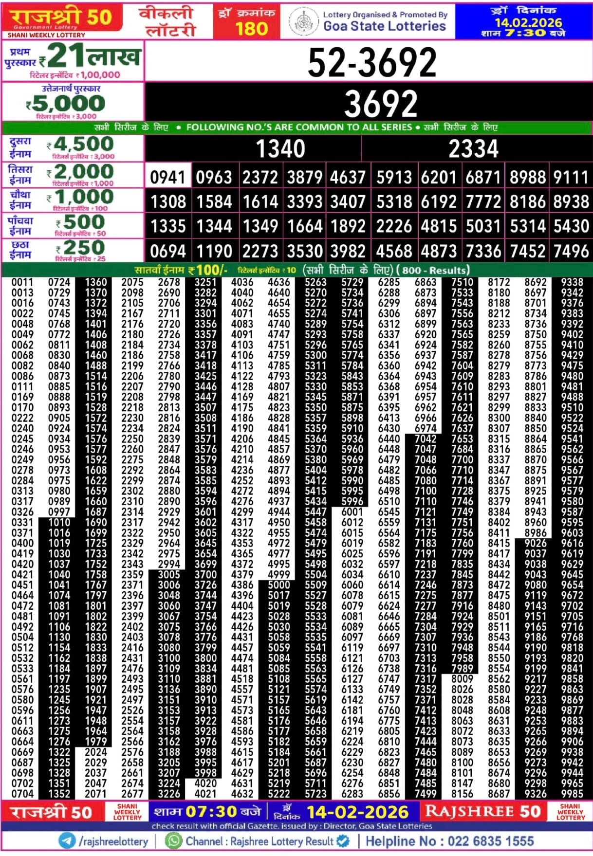 Rajshree 50 Shani Weekly Lottery 14.02.2026 Result 7.30 PM