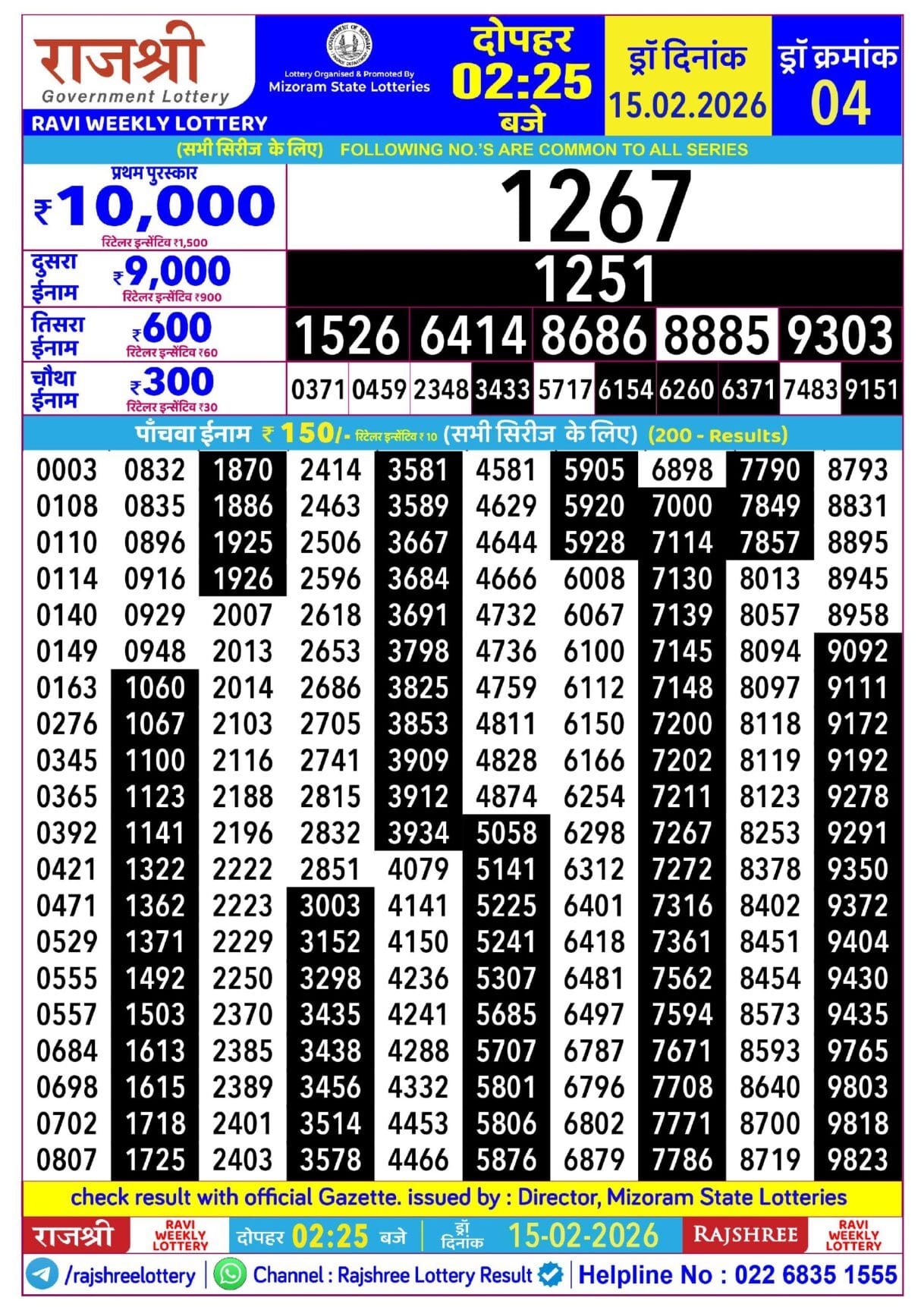 Rajshree Ravi Weekly Lottery 15.02.2026 Result 2.25pm
