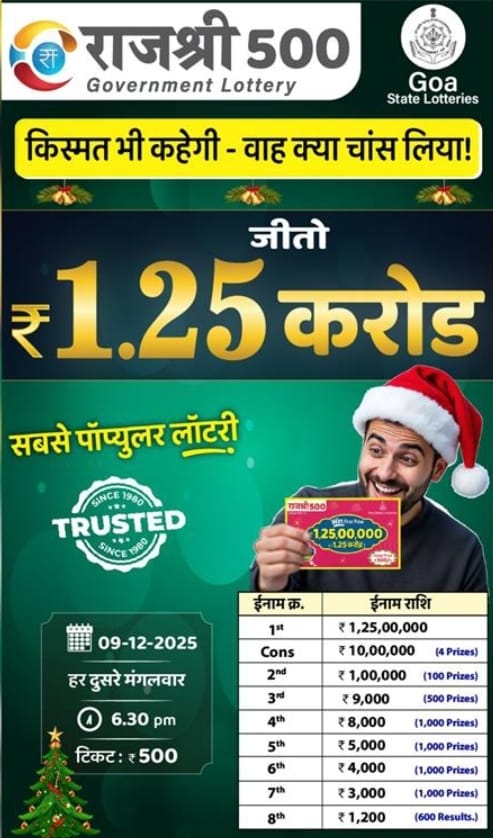 Goa State Rajshree 500 Monthly Lottery 9.12.2025 At 6.30pm