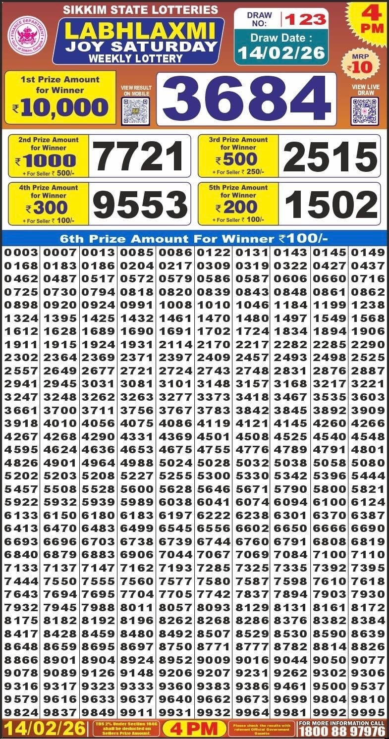 Sikkim State Labhlaxmi Joy Saturday Weekly Lottery 14.2.2026 Result 4 PM