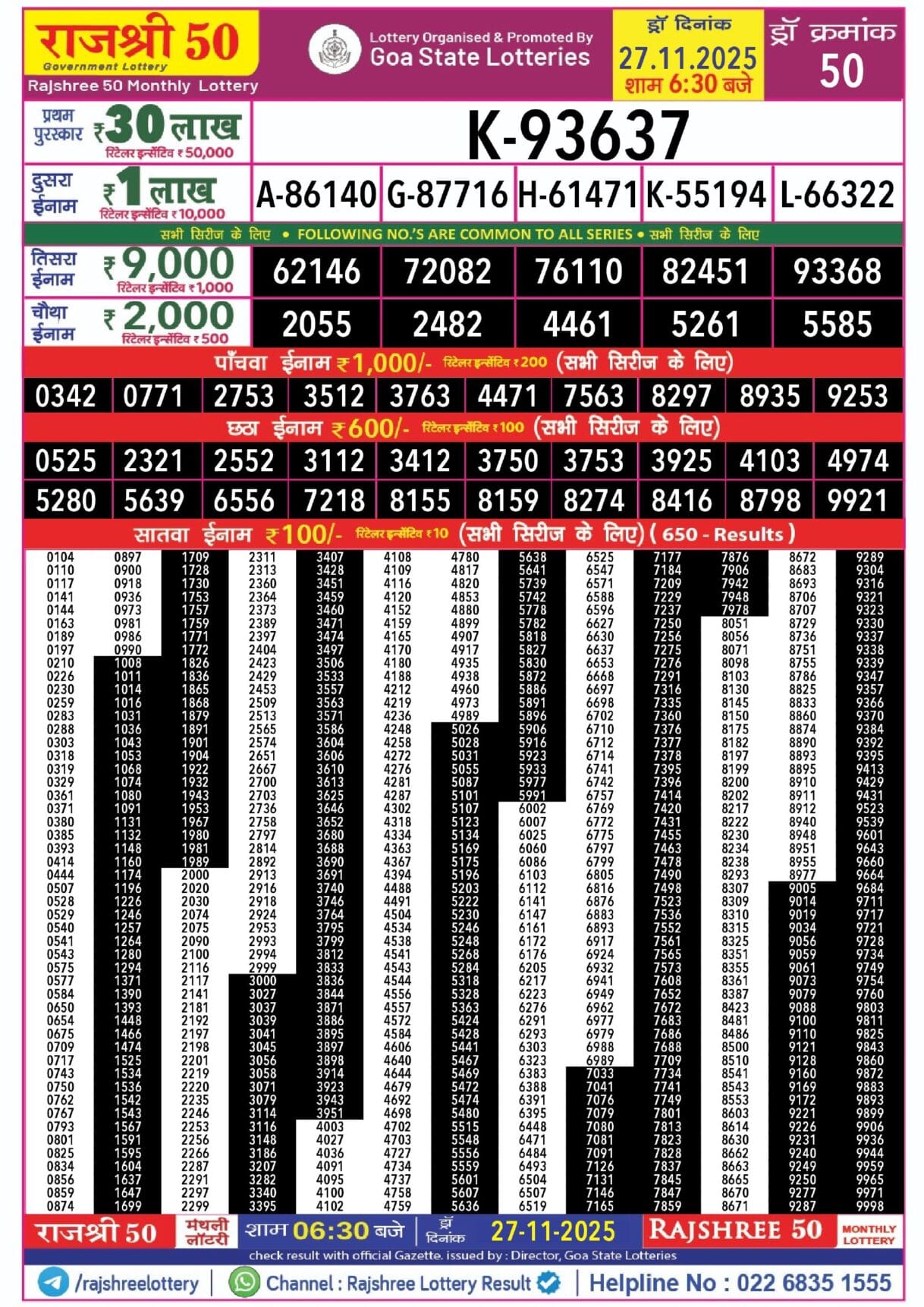 Goa state rajshree 50 monthly lottery 27.11.2025 at 6.30pm