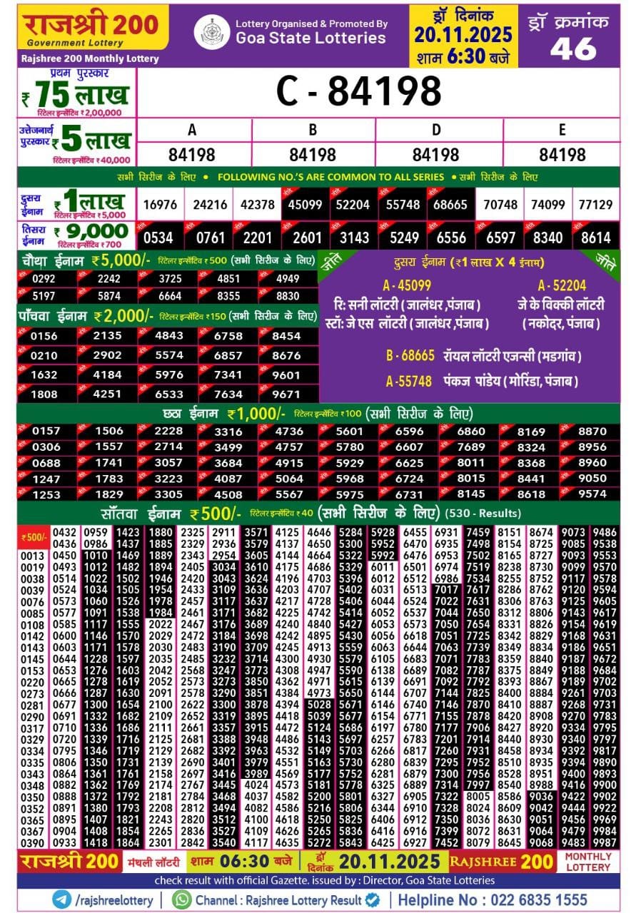 Rajshree 200 Monthly Lottery Result 20.11.2025 At 6.30 PM