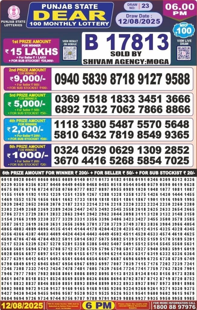 Punjab State 100 Monthly Lottery Result 12.08.2025