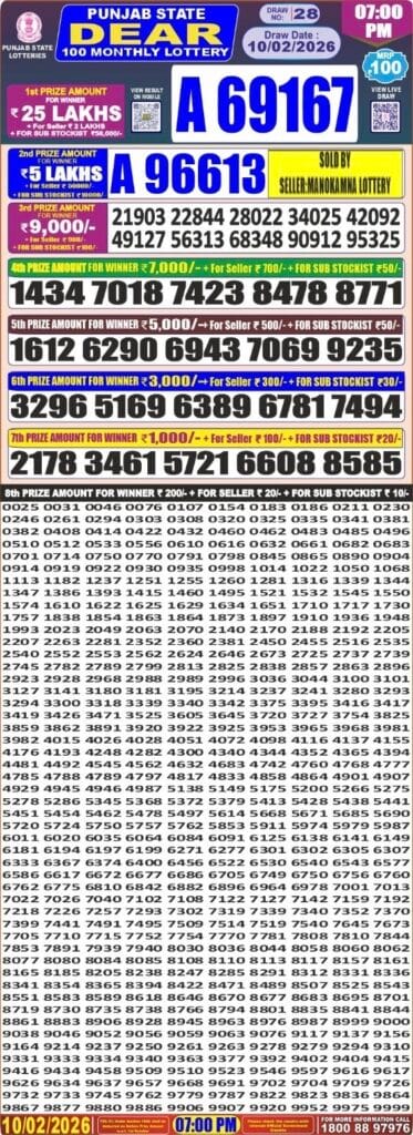 Punjab State Dear 100 Monthly Lottery 10.2.2026 Result 7 PM 0 Likes 46 Views Related Articles 0 68Punjab State Dear 50 Buster Wednesday 6pm Lottery Result 12.11.2025 0 126Punjab state dear 50 monthly lottery 15-07-2025 at 6pm 0 117Punjab state dear 100 monthly lottery 9.9.2025 result 6pm 0 97Maharashtra Ganeshlaxmi Shubh Weekly Draw 28.10.2025 Result 5pm