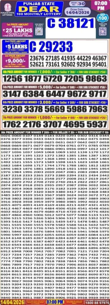 Punjab State Dear 100 Monthly Lottery 14.04.2026 Result 7 PM 0 Likes 15 Views Related Articles 0 75Punjab State Dear 50 Ranger Sunday 6pm Lottery Result 09.11.2025 0 18Maharashtra Gajlaxmi Som Weekly Lottery 13.04.2026 Result 4.45 PM 0 185Maharashtra Sahyadri Vijayalaxmi Weekly Draw 28.01.2026 Result 4.30pm 0 85Punjab State Dear 50 Jackal Saturday Weekly Lottery 14.2.2026 Result 5 PM