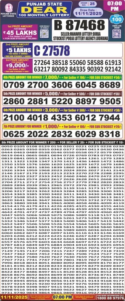 Punjab state dear 100 monthly lottery 7pm result 11.11.2025 0 Likes 62 Views Related Articles 0 40Nagaland State Dear Special Bumper 2025 Lottery 22 November 2025 At 6 PM 0 121Mizoram state golden 100 gold monthly lottery 5.11.2025 At 6.30 PM 0 25Maharashtra Padmini Weekly Draw Result 23.12.2025 0 58Maharashtra Ganeshlaxmi Bhagyashali Weekly Draw 21.07.2025 Result 5pm
