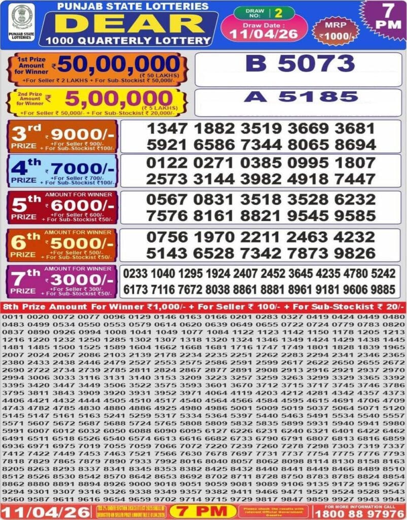 Punjab State Dear 1000 Quarterly Lottery 11.04.2026 Result 7 PM 0 Likes 7 Views Related Articles 0 49Maharashtra Gajlaxmi Ravi Weekly Draw 29.03.2026 Result 4.45 PM 0 115Maharashtra Ganeshlaxmi Ashadhi Special (Monthly) Draw Result 22.07.2025 0 126Maharashtra Gajlaxmi Shukra Weekly Draw 28.11.2025 Result 4.45pm 0 110Maharashtra Gajlaxmi Guru Weekly Draw 19.03.2026 Result 4.45 PM
