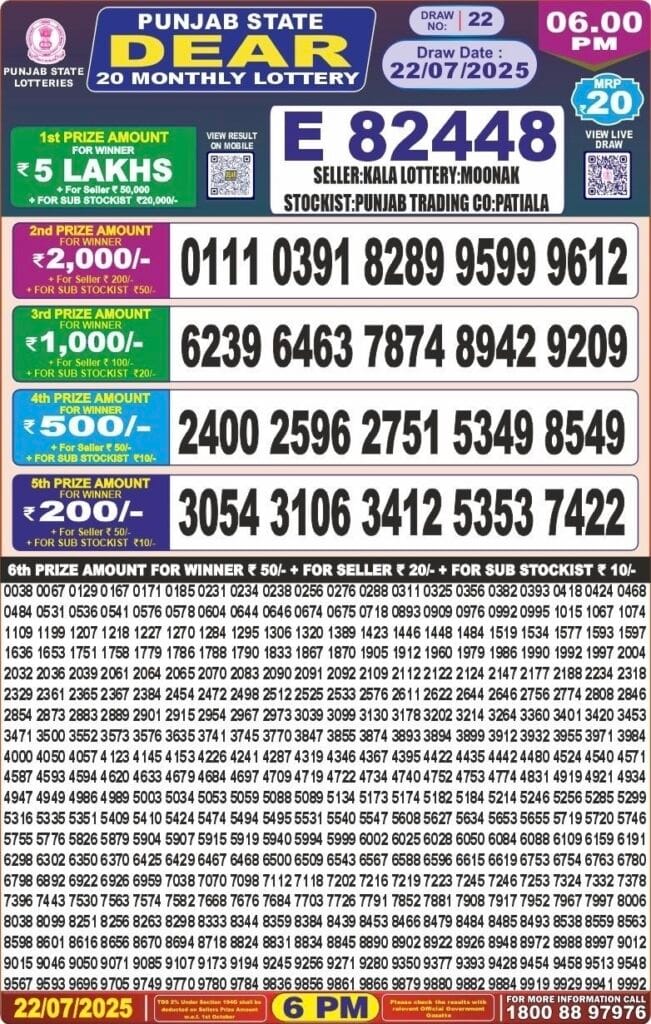 Punjab state dear 20 monthly lottery 22.07.2025 result 6pm 0 Likes 122 Views Related Articles 0 85Rajshree 50 Shukra Weekly Lottery 20.2.2026 Result 7.30 PM 0 47Rajshree Ravi Weekly Lottery 01.03.2026 Result 2.25 PM 0 32Rajshree 10 Evening Shani Weekly Lottery 04.04.2026 Result 5.40 PM 7 845Punjab state dear 20 monthly lottery 27.1.2026 at 7pm