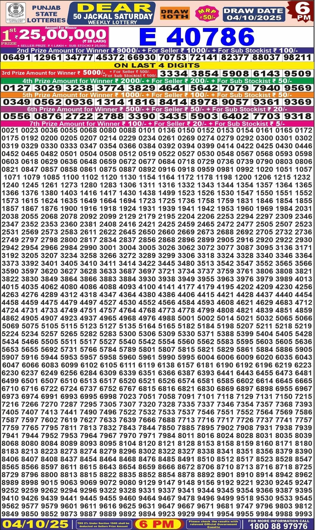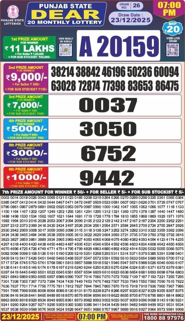 Punjab State Dear 20 Monthly Lottery 23.12.2025 Result 7 PM 0 Likes 21 Views Related Articles 0 27Maharashtra Ganeshlaxmi Shubh Weekly Draw 16.12.2025 Result 4.45pm 1 90Punjab State Dear 50 Jackal Saturday 6pm Lottery Result 04.10.2025 0 55Maharashtra Vaibhavlaxmi Weekly Draw Result 05.12.2025 0 110Punjab state dear 200 monthly lottery 04.10.2025 result 8pm