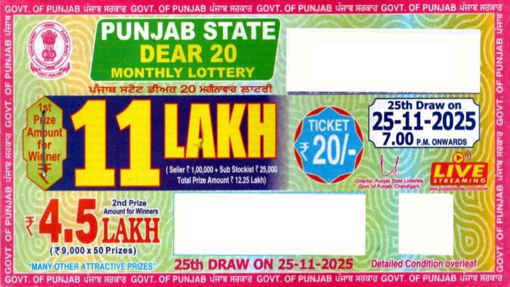 Punjab State Dear 20 Monthly Lottery 25th Draw On Tuesday, 25 November 2025 At 7 PM Onwards. You can watch result on lotteryresultsnow.in