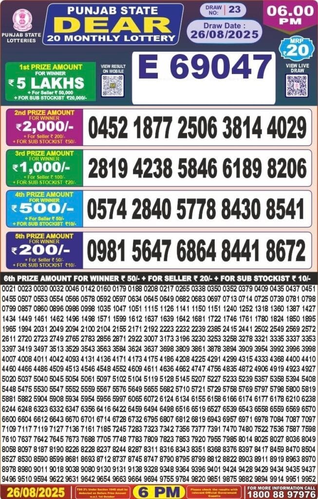 Punjab state dear 20 monthly lottery 26.8.2025 result 6pm 0 Likes 83 Views Related Articles 0 57Maharashtra Gajlaxmi Ravi Weekly Draw 30.11.2025 Result 4.45pm 0 76Maharashtra Ganeshlaxmi Shubh Weekly Draw 22.07.2025 Result 5pm 0 57Rajshree marigold monday Weekly Lottery 4PM Result 21.07.2025 0 72Maharashtra Akarshak Pushkaraj Weekly Draw Result 24.07.2025