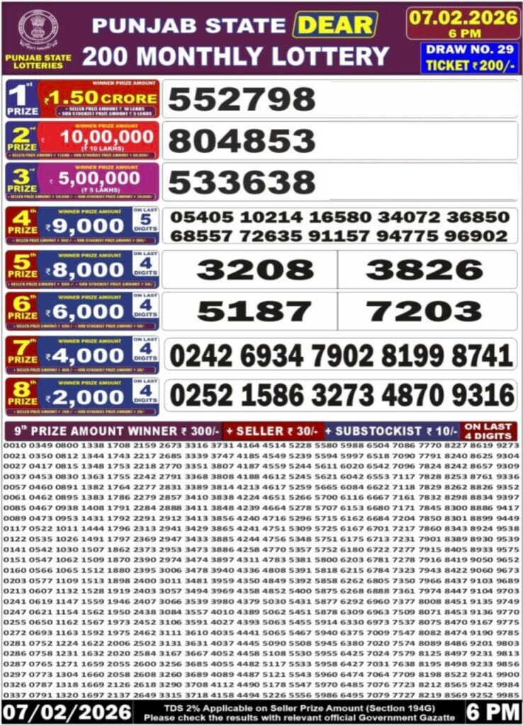 Punjab State Dear 200 Monthly Lottery 7.2.2026 Result 6 PM 0 Likes 52 Views Related Articles 2 111Punjab State Dear 20 Monthly Lottery 7PM Result 25.11.2025 1 117Maharashtra Gajlaxmi Shani Weekly Draw 03.01.2026 Result 4.45 PM 0 94Punjab State Dear 50 Chief Thursday 6pm Lottery Result 18.12.2025 0 75Maharashtra Gajlaxmi Som Weekly Draw 21.07.2025 Result 4.45pm
