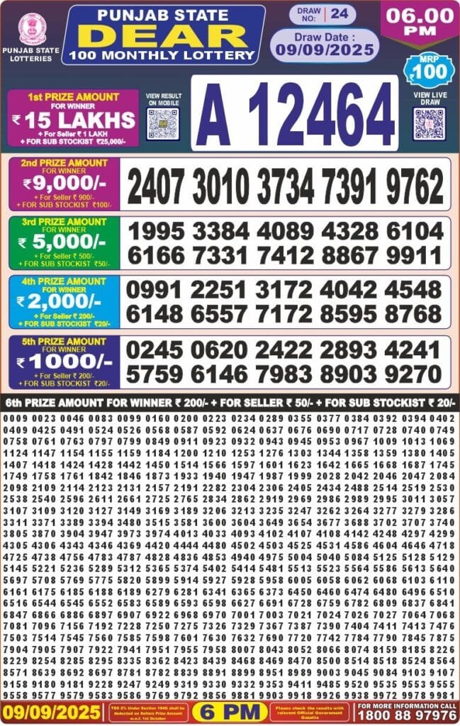 Punjab state dear 100 monthly lottery 9.9.2025 result 6pm 0 Likes 80 Views Related Articles 0 31Punjab State Dear 50 Bronco Tuesday 6pm Lottery Result 23.12.2025 0 50Punjab State Dear 50 Beast Monday 6pm Lottery Result 10.11.2025 2 56Punjab State Dear 20 Monthly Lottery 7PM Result 25.11.2025 0 96Punjab state dear 50 chief thursday weekly lottery 31.07.2025 result 6pm