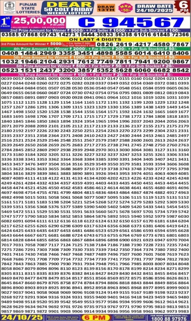Punjab State Dear 50 Colt Friday 6pm Lottery Result 24.10.2025