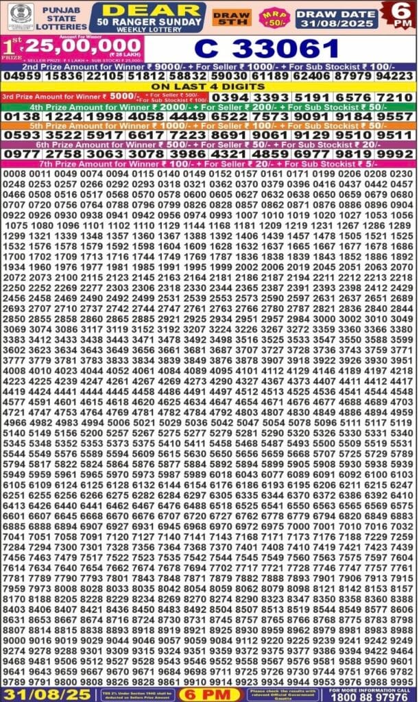 Punjab State Dear 50 Ranger Sunday 6pm Lottery Result 31.08.2025