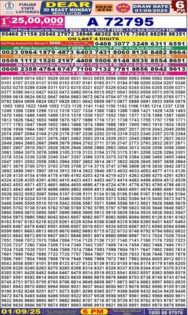 Punjab State Dear 50 Beast Monday 6pm Lottery Result 01.09.2025 0 Likes 73 Views Related Articles 0 52Rajshree Weekly Lottery 8PM Result 20.07.2025 0 51Punjab State Dear 50 Bronco Tuesday 6pm Lottery Result 02.12.2025 0 51Maharashtra Ganeshlaxmi Dhan Weekly Draw 12.12.2025 Result 5pm 0 40Maharashtra Sahyadri Prabhalaxmi Weekly Draw 15.11.2025 Result 4.30pm
