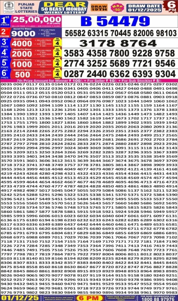 Punjab State Dear 50 Beast Monday 6pm Lottery Result 01.12.2025 1 Likes 38 Views Related Articles 0 45Punjab State Dear Diwali Bumper 2025 ₹11 Crore Biggest Jackpot Winning Number ! 0 59Rajshree 200 Monthly Lottery Result 18.09.2025 At 6.30 PM 0 47Maharashtra Ganeshlaxmi Dhan Weekly Draw 07.11.2025 Result 5pm 0 50Punjab State Dear 50 Ranger Sunday 6pm Lottery Result 02.11.2025