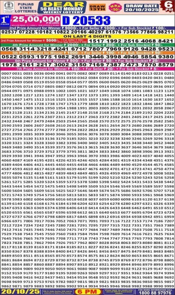 Punjab State Dear 50 Beast Monday 6pm Lottery Result 20.10.2025 0 Likes 59 Views Related Articles 0 50Punjab State Dear 50 Beast Monday 6pm Lottery Result 13.10.2025 5 139Punjab state dear 100 monthly lottery 11.11.2025 at 7pm 0 46Maharashtra Ganeshlaxmi Dhan Weekly Draw 24.10.2025 Result 5pm 0 48Maharashtra Sagarlaxmi Weekly Draw Result 08.12.2025