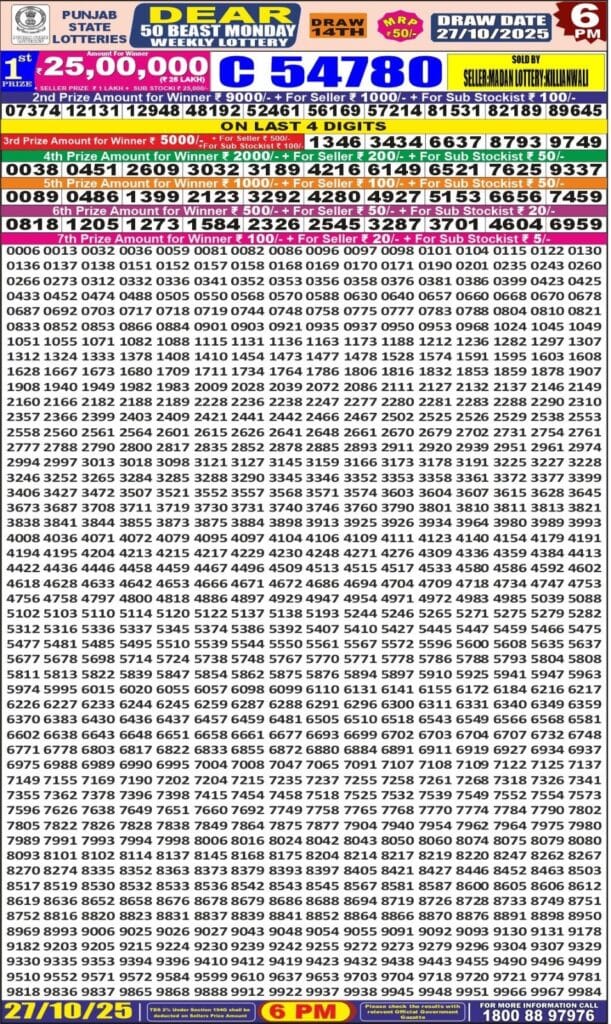 Punjab State Dear 50 Beast Monday 6pm Lottery Result 27.10.2025 0 Likes 80 Views Related Articles 0 56Punjab State Dear 200 Monthly Lottery 7 Febraury 2026 At 6 PM 0 31Rajshree 200 Monthly Lottery 19.2.2026 Result 6.30 PM 0 129Maharashtra Gajlaxmi Shani Weekly Draw 01.11.2025 Result 4.45 PM 0 92Maharashtra Gajlaxmi Ravi Weekly Draw 04.01.2026 Result 4.45 PM