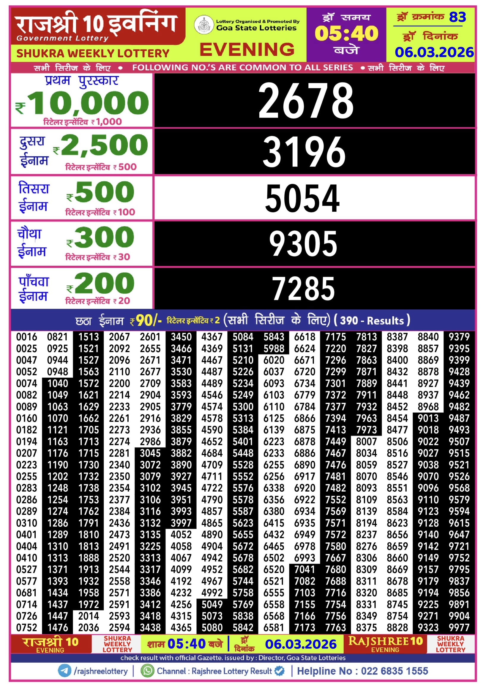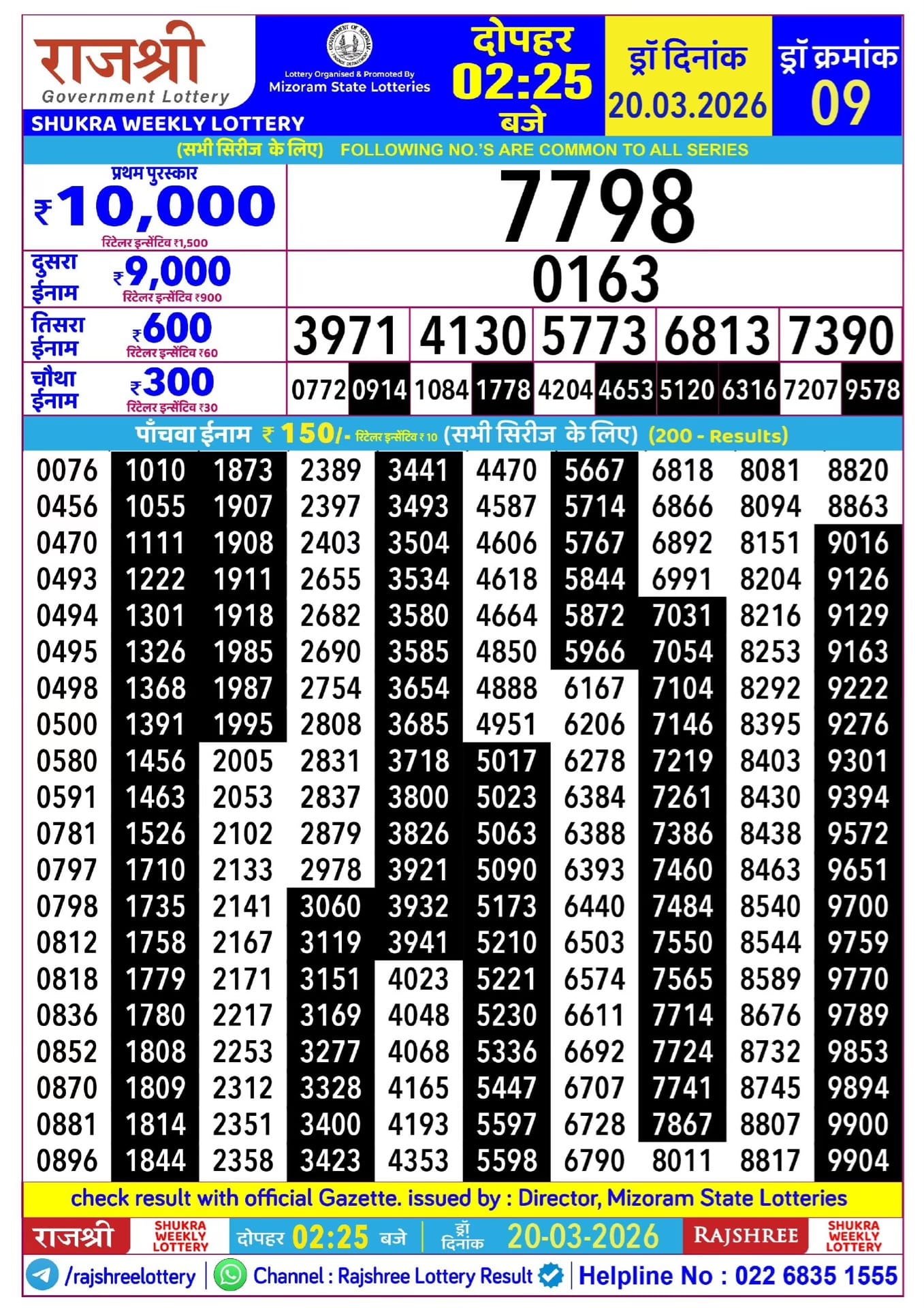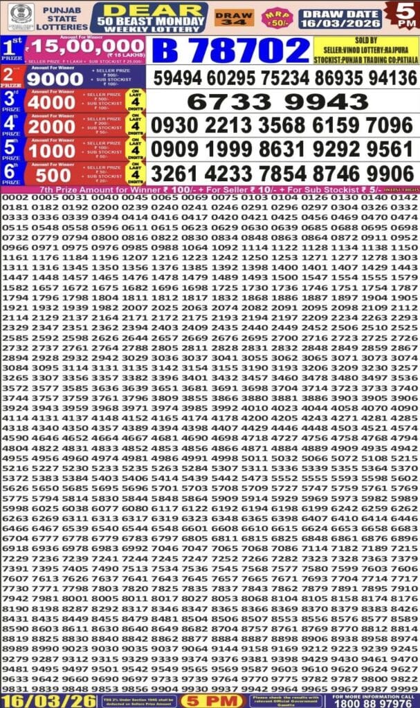 Punjab State Dear 50 Beast Monday Weekly Lottery 16.03.2026 Result 5 PM 0 Likes 38 Views Related Articles 0 93Maharashtra Sahyadri Mahalaxmi Weekly Draw 18.11.2025 Result 4.30pm 0 62Rajshree Shukra Weekly Lottery 20.03.2026 Result 2.25 PM 0 40Rajshree 10 Evening Shukra Weekly Lottery 06.03.2026 Result 5.40 PM 0 47Maharashtra Gajlaxmi Ravi Weekly Draw 22.02.2026 Result 4.45 PM