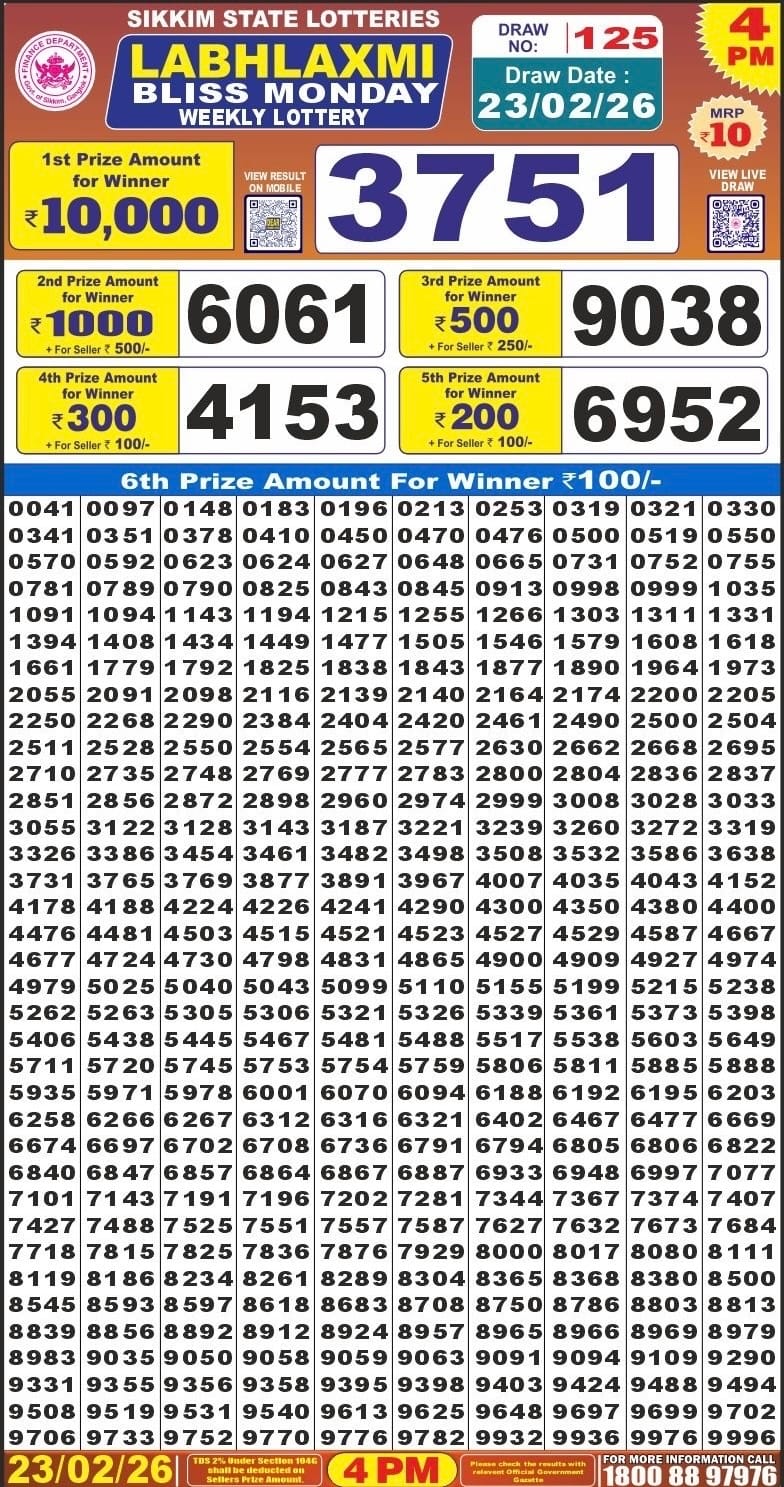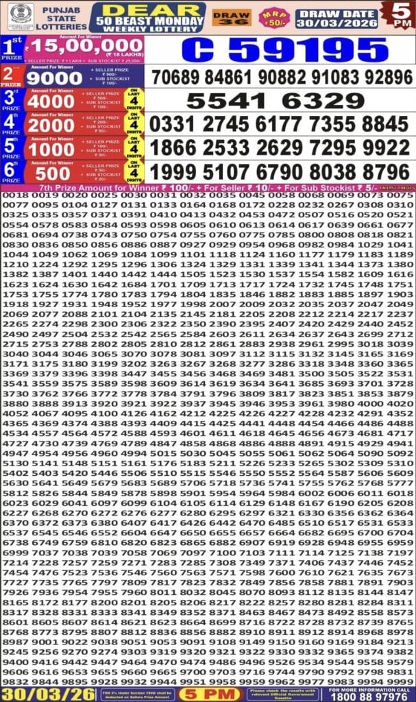 Punjab State Dear 50 Beast Monday Weekly Lottery 30.03.2026 Result 5 PM 0 Likes 18 Views Related Articles 0 51Rajshree Guru Weekly Lottery 19.2.2026 Result 2.25 PM 0 37Rajshree Mangal Weekly Lottery 24.2.2026 Result 2.25 PM 0 57Golden Star Ravi Weekly Lottery 01.03.2026 Result 7 PM 0 142Maharashtra Sahyadri Mahalaxmi Weekly Draw 28.10.2025 Result 4.30pm