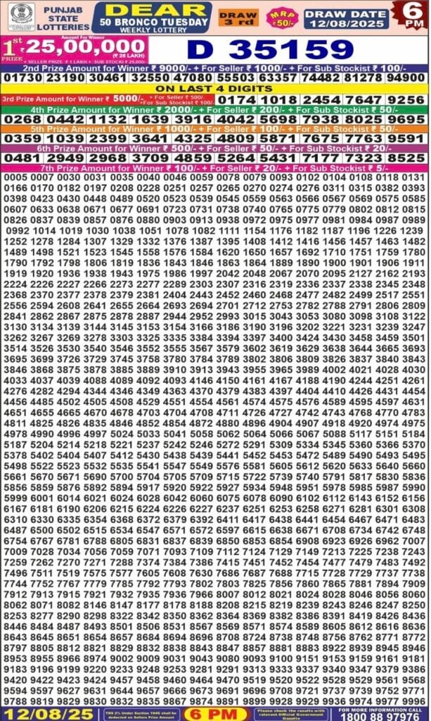 Punjab State Dear 50 Bronco Tuesday 6pm Lottery Result 12.08.2025 0 Likes 85 Views Related Articles 0 85Maharashtra Sagarlaxmi Weekly Draw Result 27.10.2025 0 44Maharashtra Vaibhavlaxmi Weekly Draw Result 07.11.2025 0 53Labh Laxmi charm weekly 4PM Result 22.07.2025 0 68Maharashtra Gajlaxmi Som Weekly Draw 10.11.2025 Result 4.45pm