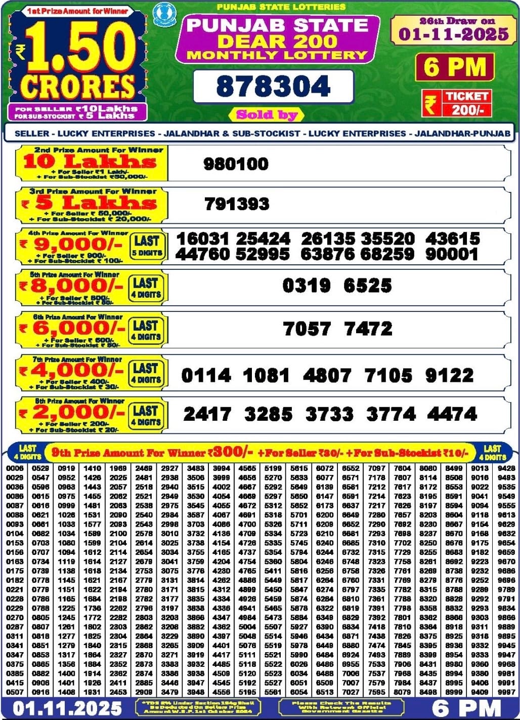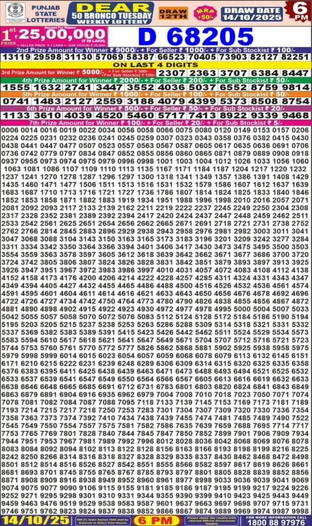 Punjab State Dear 50 Bronco Tuesday 6pm Lottery Result 14.10.2025 0 Likes 55 Views Related Articles 0 7Maharashtra Ganeshlaxmi Vijayee Weekly Draw 24.12.2025 Result 5pm 0 48Maharashtra Gajlaxmi Shukra Weekly Draw 14.11.2025 Result 4.45pm 1 82Punjab State Dear Diwali Bumper 31.10.2025 At 8 PM 0 81Punjab State Dear 200 Monthly Lottery 1.11.2025 Result 6PM