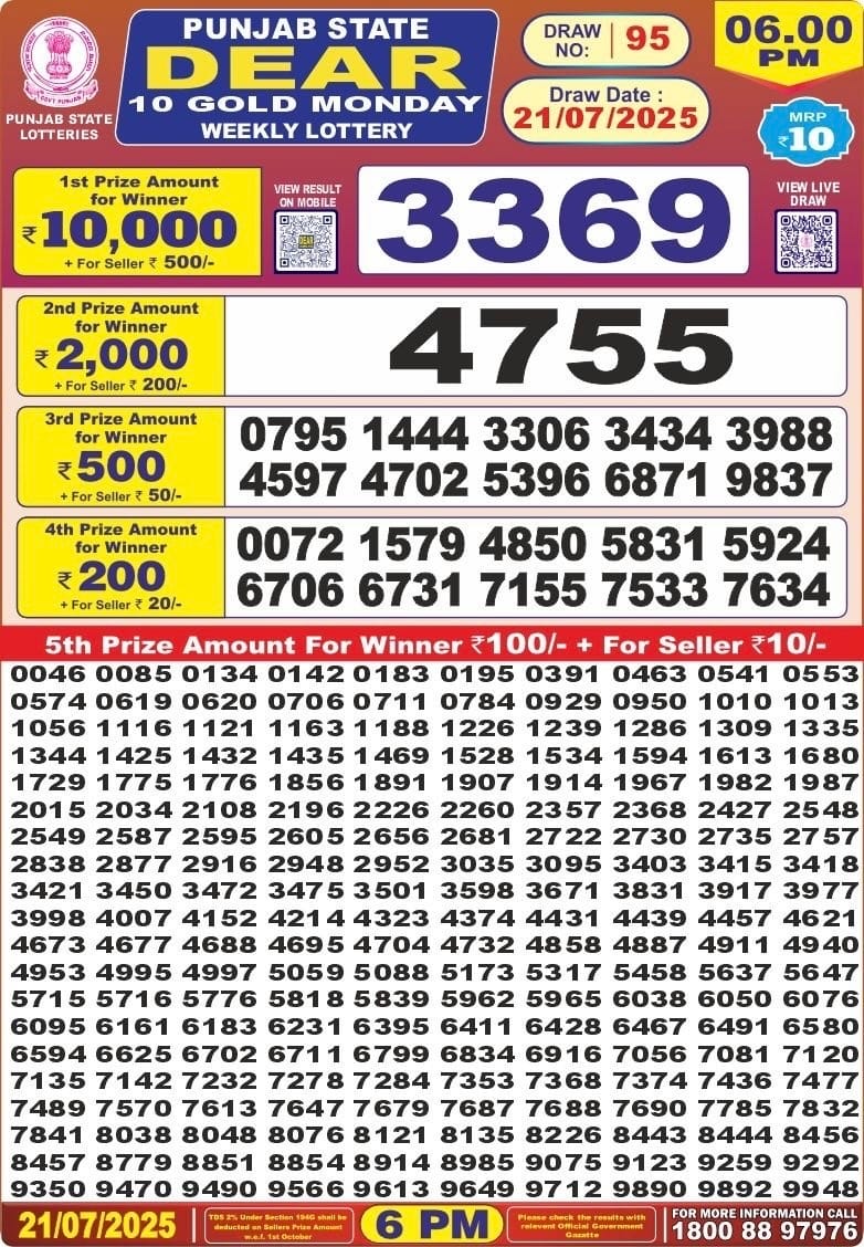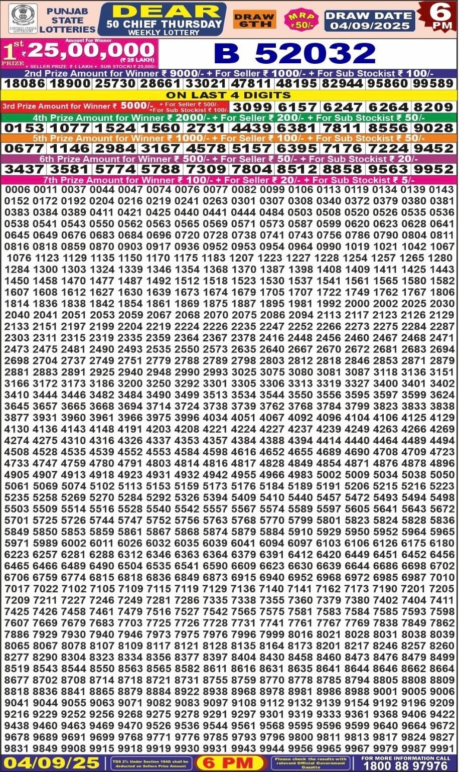 Punjab State Dear 50 Bronco Tuesday 6pm Lottery Result 23.12.2025 0 Likes 26 Views Related Articles 0 77Punjab State Dear 50 Chief Thursday 6pm Lottery Result 04.09.2025 0 46Maharashtra Ganeshlaxmi Bhagyashali Lottery 03.11.2025 Result 5pm 0 48Goa state rajshree 250 monthly lottery 7.10.2025 at 6.30pm 0 43Maharashtra Vaibhavlaxmi Weekly Draw Result 07.11.2025