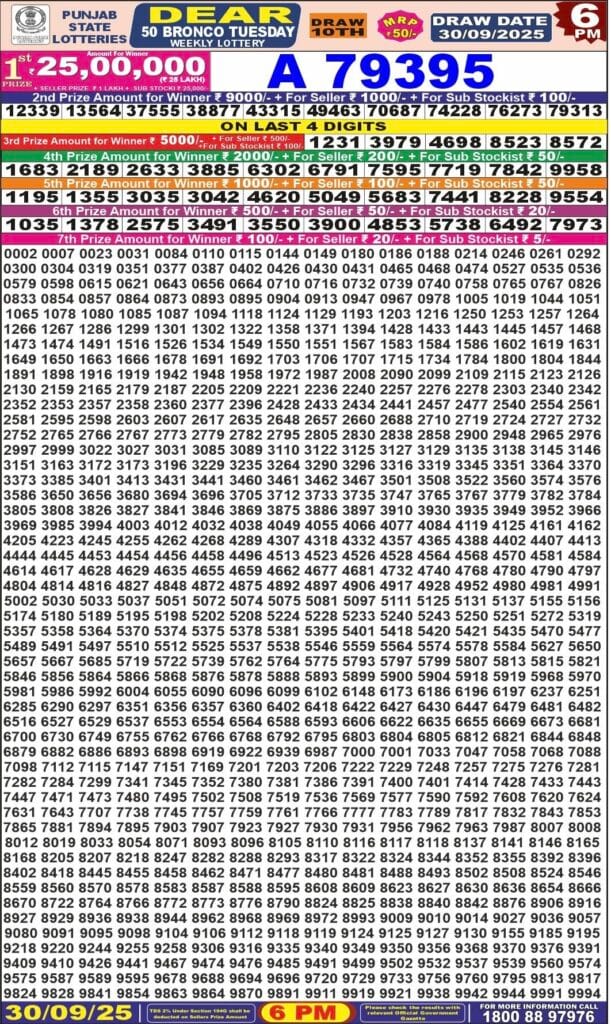 Punjab State Dear 50 Bronco Tuesday 6pm Lottery Result 30.09.2025 0 Likes 93 Views Related Articles 2 86Goa state rajshree 50 monthly lottery 27.11.2025 at 6.30pm 0 72Maharashtra Akarshak Pushkaraj Weekly Draw Result 24.07.2025 0 57Punjab State Dear 50 Jackal Saturday 6pm Lottery Result 20.09.2025 0 62पंजाब स्टेट डियर दिवाली बंपर 2025 रिजल्ट !