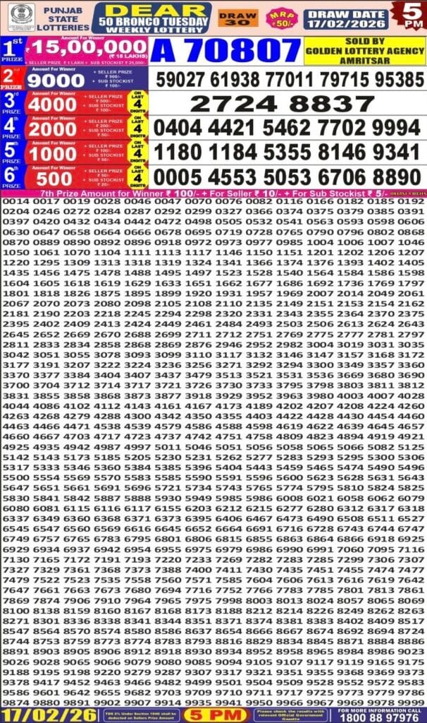 Punjab State Dear 50 Bronco Tuesday Weekly Lottery 17.02.2026 Result 5 PM 0 Likes 52 Views Related Articles 0 79Nagaland State Dear 2000 Monthly Lottery 8 November 2025 At 7 PM 0 111Rajshree sunflower sunday Weekly Lottery 4PM Result 20.07.2025 0 141Maharashtra Ganeshlaxmi Samruddhi Weekly Draw 07.02.2026 Result 5 PM 0 60Rajshree 10 Evening Shukra Weekly Lottery 20.03.2026 Result 5.40 PM
