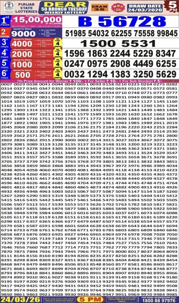 Punjab State Dear 50 Bronco Tuesday Weekly Lottery 24.03.2026 Result 5 PM 0 Likes 29 Views Related Articles 0 143Maharashtra Sahyadri Mahalaxmi Weekly Draw 28.10.2025 Result 4.30pm 0 141Punjab state dear 50 Buster Wednesday Lottery 30.07.2025 Result 6PM 0 98Rajshree Lotus Thursday Weekly Lottery 4PM Result 24.07.2025 1 106Punjab State Dear 50 Colt Friday 6pm Lottery Result 02.01.2026