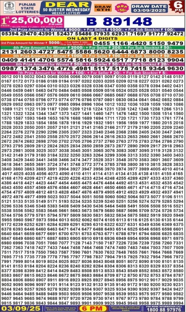 Punjab State Dear 50 Buster Wednesday 6pm Lottery Result 03.09.2025 1 Likes 65 Views Related Articles 0 47Maharashtra Sahyadri Mahalaxmi Weekly Draw 11.11.2025 Result 4.30pm 0 49Maharashtra Sahyadri Mahalaxmi Weekly Draw 18.11.2025 Result 4.30pm 0 63Maharashtra Gajlaxmi Som Weekly Draw 27.10.2025 Result 4.45pm 0 57Maharashtra Sahyadri Rajlaxmi Weekly Draw 21.11.2025 Result 4.30pm