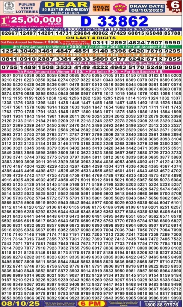Punjab State Dear 50 Buster Wednesday 6pm Lottery Result 08.10.2025 0 Likes 39 Views Related Articles 0 49Maharashtra Gajlaxmi Shukra Weekly Draw 07.11.2025 Result 4.45pm 1 63Rajshree 75 monthly lottery 13.11.2025 at 6.30pm 0 39Maharashtra Gajlaxmi Ravi Weekly Draw 14.12.2025 Result 4.45pm 1 300Punjab state dear 200 monthly lottery 5-7-2025 at 8pm