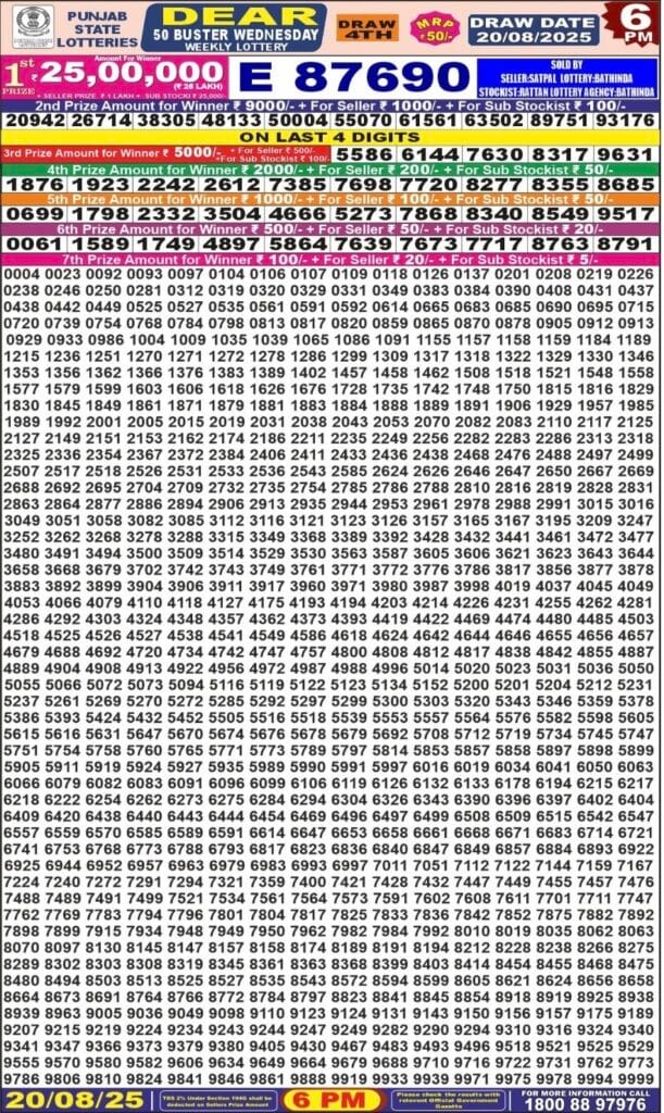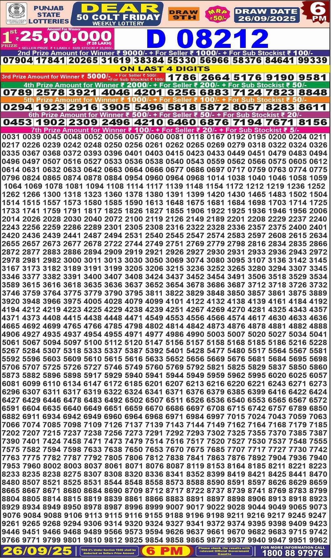 Punjab State Dear 50 Buster Wednesday 6pm Lottery Result 20.08.2025 0 Likes 77 Views Related Articles 0 55Maharashtra Ganeshlaxmi Samruddhi Weekly Draw 22.11.2025 Result 5pm 0 50Punjab State Dear 50 Colt Friday 6pm Lottery Result 26.09.2025 1 272Sikkim state dear ganesh chaturthi bumper lottery 2025 new scheme 0 62Punjab state dear 10 6pm lottery result 20.07.2025