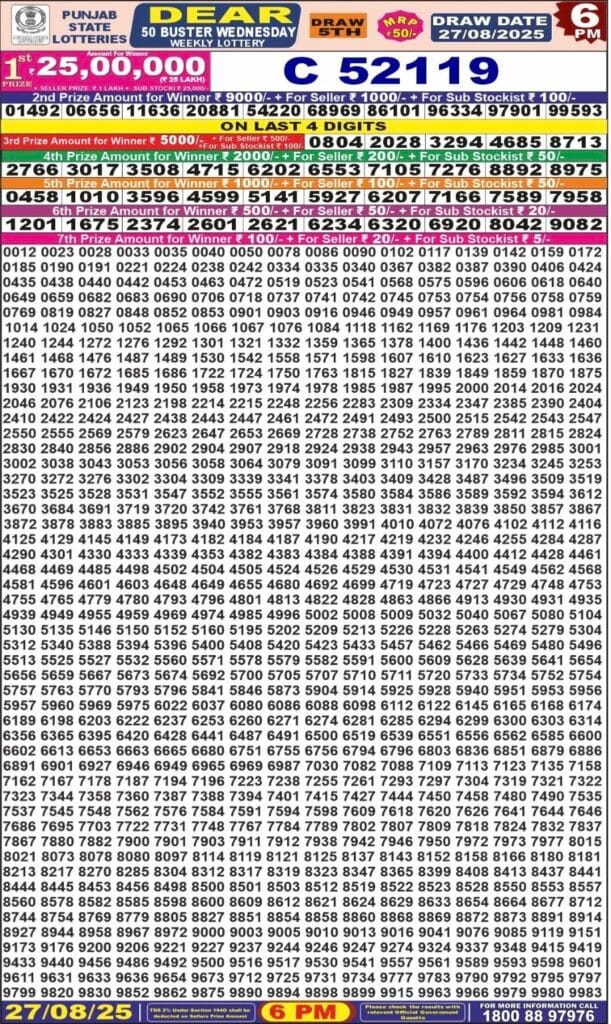 Punjab State Dear 50 Buster Wednesday 6pm Lottery Result 27.08.2025 1 Likes 102 Views Related Articles 1 118Punjab State Dear 50 Bronco Tuesday 6pm Lottery Result 09.12.2025 0 49Punjab State Dear 50 Beast Monday 6pm Lottery Result 19.01.2026 0 20Maharashtra Sahyadri Monthly Lottery Draw 10.2.2026 At 4 PM 0 84Maharashtra Gajraj (Monthly) Draw Result 27.12.2025