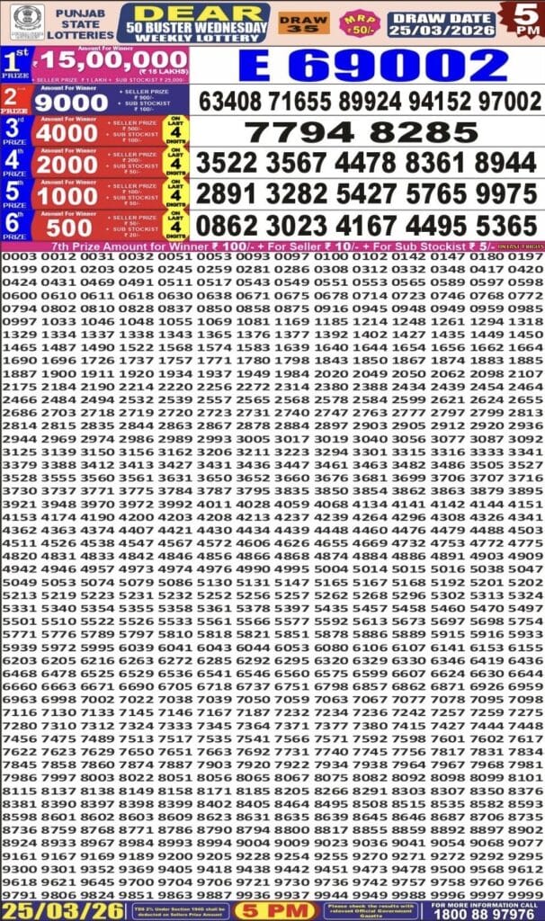 Punjab State Dear 50 Buster Wednesday Weekly Lottery 25.03.2026 Result 5 PM 0 Likes 35 Views Related Articles 0 130Maharashtra Gajlaxmi Mangal Weekly Draw 04.11.2025 Result 4.45pm 0 77Goa State Rajshree 80 Monthly Lottery 8.1.2026 At 6.30 PM 0 32Maharashtra Gajlaxmi Shukra Weekly Draw 27.03.2026 Result 4.45 PM 1 441Golden 200 Gold Monthly Lottery 18 Febraury 2026 At 6.30 PM