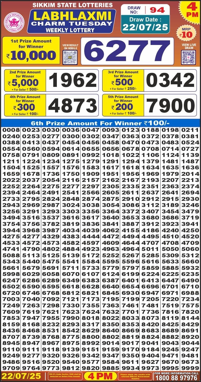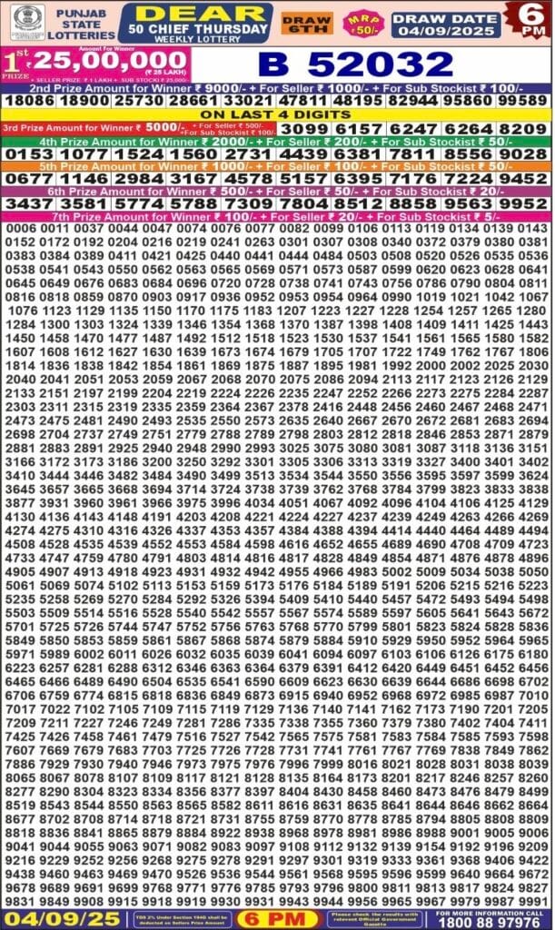 Punjab State Dear 50 Chief Thursday 6pm Lottery Result 04.09.2025 0 Likes 77 Views Related Articles 0 16Maharashtra Sahyadri Dhanlaxmi Weekly Draw 22.12.2025 Result 4.30pm 0 53Labh Laxmi Delight weekly Lottery 4PM Result 23.07.2025 0 53Labh Laxmi charm weekly 4PM Result 22.07.2025 0 66Punjab State Dear 50 Colt Friday 6pm Lottery Result 03.10.2025