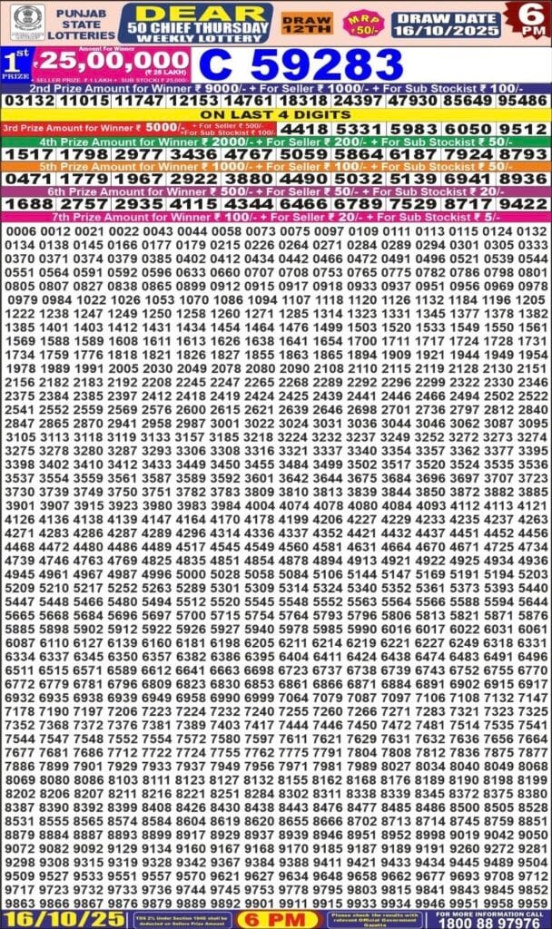 Punjab State Dear 50 Chief Thursday 6pm Lottery Result 16.10.2025 0 Likes 57 Views Related Articles 0 62Golden Star Weekly Lottery result 19 July 2025 0 47Punjab State Dear 50 Buster Wednesday 6pm Lottery Result 10.12.2025 0 51Golden 500 Gold Monthly Lottery Result 08.10.2025 At 6.30 PM 0 56Maharashtra Akshay Weekly Draw Result 12.11.2025