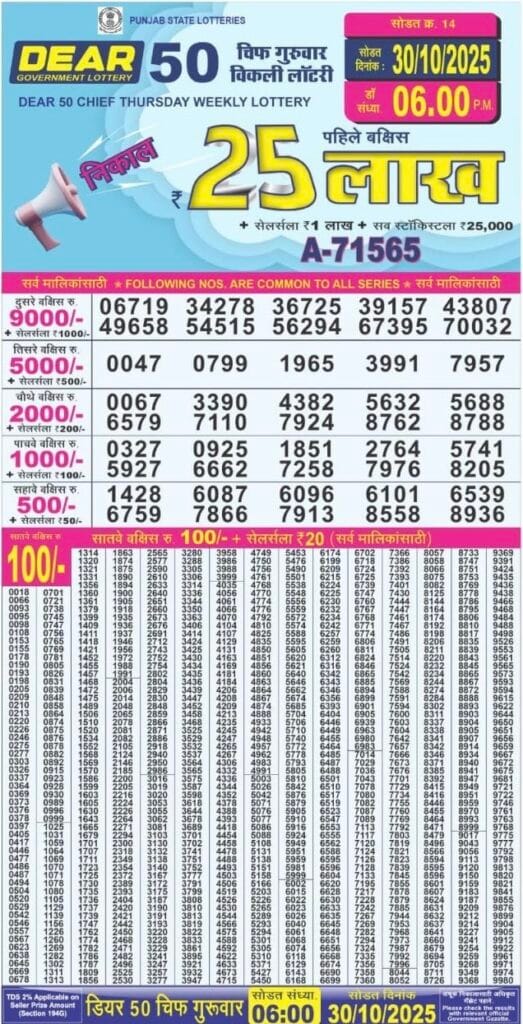 Punjab State Dear 50 Chief Thursday 6pm Lottery Result 30.10.2025 0 Likes 78 Views Related Articles 0 47Maharashtra Sahyadri Mahalaxmi Weekly Draw 11.11.2025 Result 4.30pm 0 88Punjab State Dear 50 Buster Wednesday Weekly Lottery 6.8.2025 Result 6PM 1 67Dear yamuna sunday Weekly 1pm result 20.07.2025 0 47Maharashtra Ganeshlaxmi Dhan Weekly Draw 07.11.2025 Result 5pm