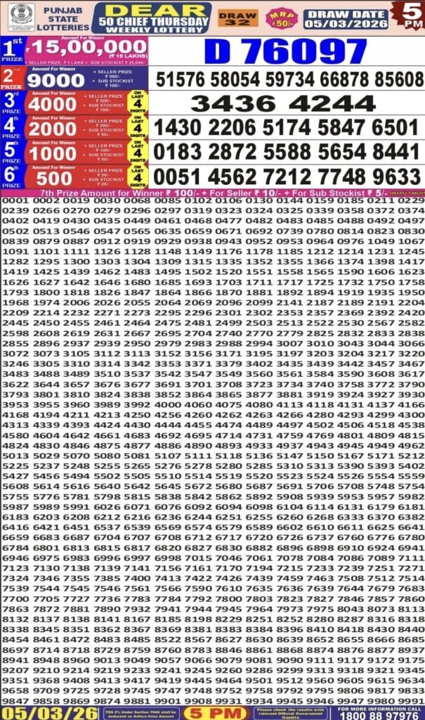 Punjab State Dear 50 Chief Thursday Weekly Lottery 05.03.2026 Result 5 PM 0 Likes 57 Views Related Articles 0 90Maharashtra Gajlaxmi Shukra Weekly Draw 16.01.2026 Result 4.45pm 0 116Maharashtra Gajlaxmi Shukra Weekly Draw 13.02.2026 Result 4.45 PM 0 40Rajshree 10 Evening Shukra Weekly Lottery 06.03.2026 Result 5.40 PM 0 265Rajshree 100 Monthly Lottery 5.2.2026 At 6.30 PM