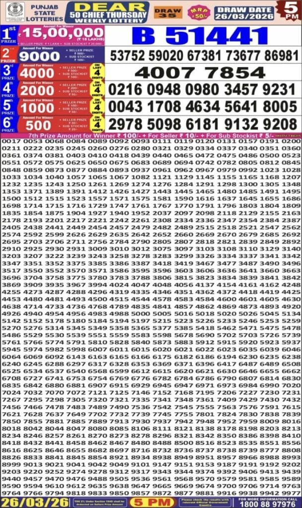 Punjab State Dear 50 Chief Thursday Weekly Lottery 26.03.2026 Result 5 PM 0 Likes 59 Views Related Articles 0 33Rajshree Budh Weekly Lottery 01.04.2026 Result 2.25 PM 0 118Maharashtra Sahyadri Dhanlaxmi Weekly Draw 05.01.2026 Result 4.30 PM 0 104Rajshree ravi Weekly Lottery 1PM Result 20.07.2025 0 80Dear 10 blue lottery 1.30PM Result 21.07.2025