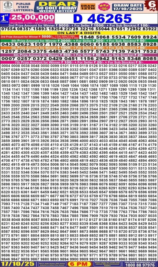 Punjab State Dear 50 Colt Friday 6pm Lottery Result 17.10.2025