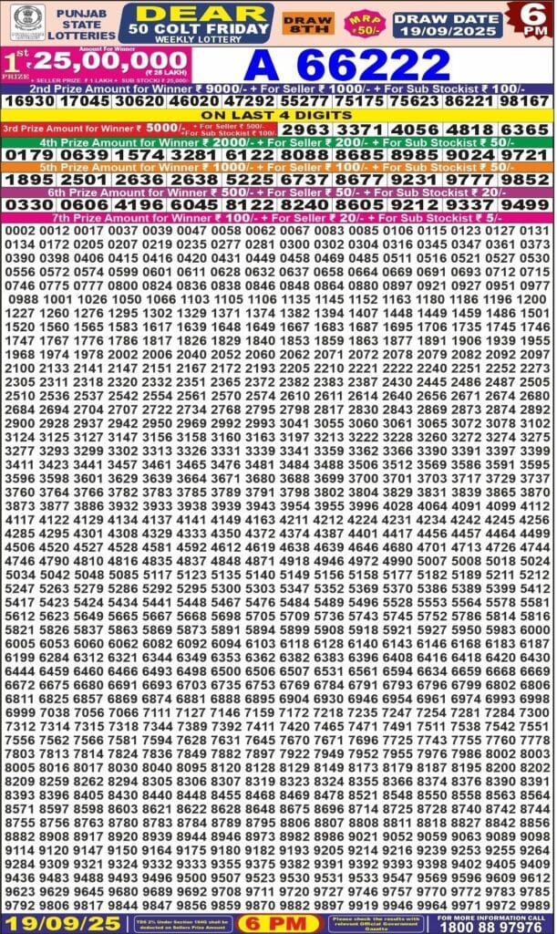 Punjab State Dear 50 Colt Friday 6pm Lottery Result 19.09.2025 0 Likes 82 Views Related Articles 0 97Maharashtra Ganeshlaxmi Bhagyashali Weekly Draw 01.12.2025 Result 5pm 0 97Maharashtra Ganeshlaxmi Shubh Weekly Draw 28.10.2025 Result 5pm 0 159Punjab state dear 100 monthly lottery 11 November 2025 At 7 PM 0 56Maharashtra Gajlaxmi Shukra Weekly Draw 09.01.2026 Result 4.45 PM