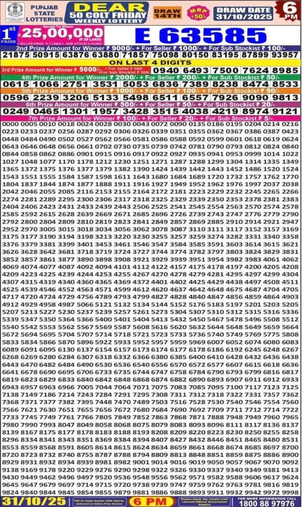 Punjab State Dear 50 Colt Friday 6pm Lottery Result 31.10.2025 2 Likes 97 Views Related Articles 0 42Punjab State Dear 50 Colt Friday 6pm Lottery Result 14.11.2025 0 88Rajshree 08.00 PM Weekly Lottery Result 24.07.2025 0 110Punjab state dear 200 monthly lottery 04.10.2025 result 8pm 0 69Golden 500 gold monthly lottery result 09.07.2025