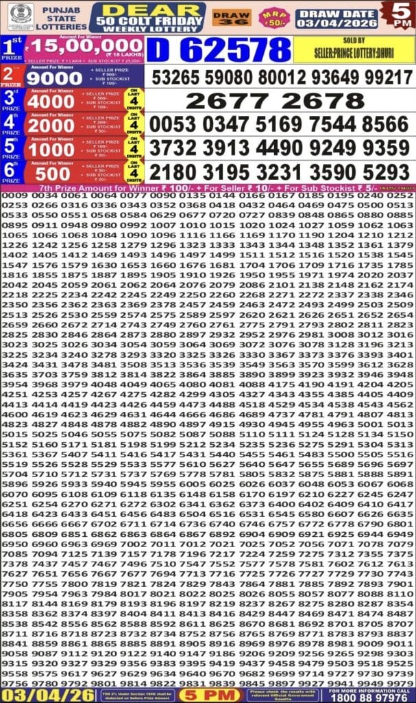 Punjab State Dear 50 Colt Friday Weekly Lottery 03.04.2026 Result 5 PM 0 Likes 26 Views Related Articles 0 65Rajshree Night Budh Weekly Lottery 18.2.2026 Result 9 PM 0 111Punjab state dear 10 6pm lottery result 20.07.2025 0 218Maharashtra Akarshak Pushkaraj Weekly Draw Result 01.01.2026 1 383Golden 250 Gold Monthly Lottery 28 January 2026 At 6.30 PM