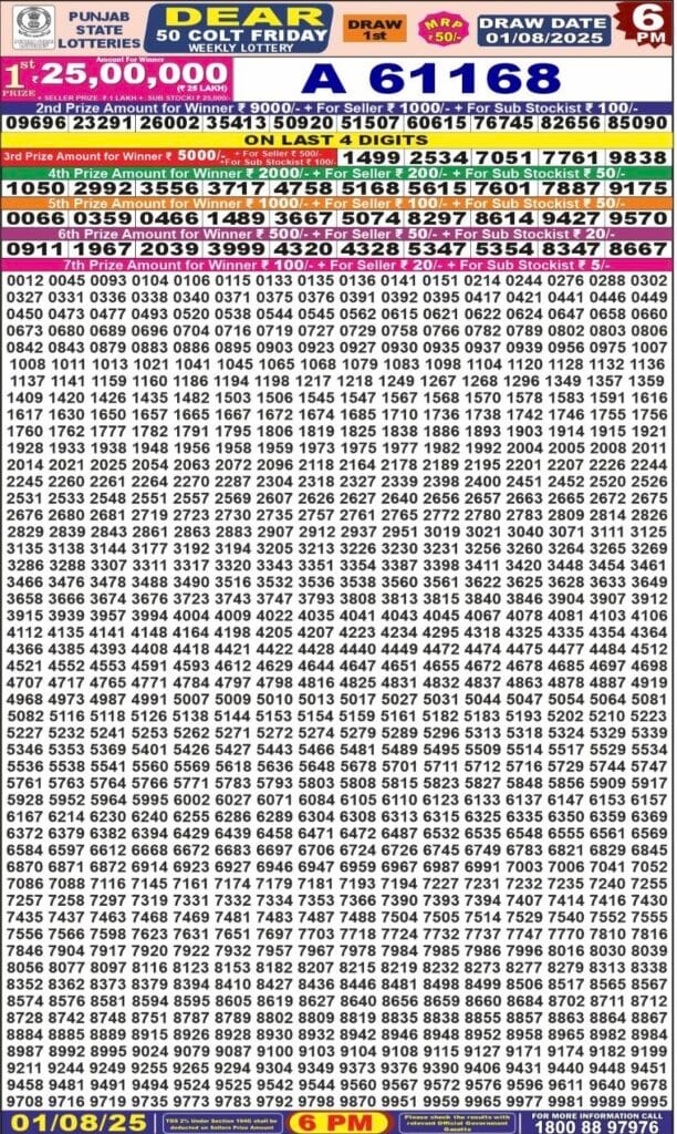 Punjab state dear 50 colt friday weekly lottery 1.8.2025 result 6pm 0 Likes 88 Views Related Articles 0 73Punjab state dear 50 Beast Monday Weekly Lottery 4.8.2025 Result 6pm 0 7Goa state rajshree 50 monthly lottery 25.12.2025 at 6.30pm 0 51Maharashtra Ganeshlaxmi Vaibhav Weekly Draw 30.11.2025 Result 5pm 0 75Punjab state dear 50 monthly lottery 15.07.2025 result 6pm