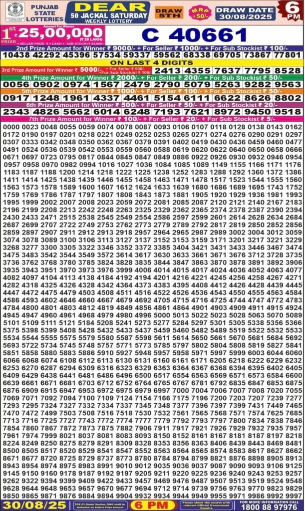 Punjab State Dear 50 Jackal Saturday 6pm Lottery Result 30.08.2025 0 Likes 84 Views Related Articles 0 94Punjab State Dear 50 Beast Monday 6pm Lottery Result 08.12.2025 0 96Maharashtra Ganeshlaxmi Samruddhi Weekly Draw Result 29.11.2025 0 121Maharashtra Gajlaxmi Shani Weekly Draw 29.11.2025 Result 4.45pm 0 50Punjab State Dear 1000 Quarterly Lottery 11 April 2026 New Scheme