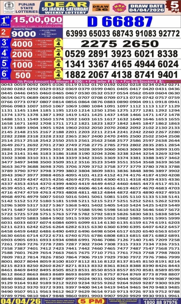 Punjab State Dear 50 Jackal Saturday Weekly Lottery 04.04.2026 Result 5 PM