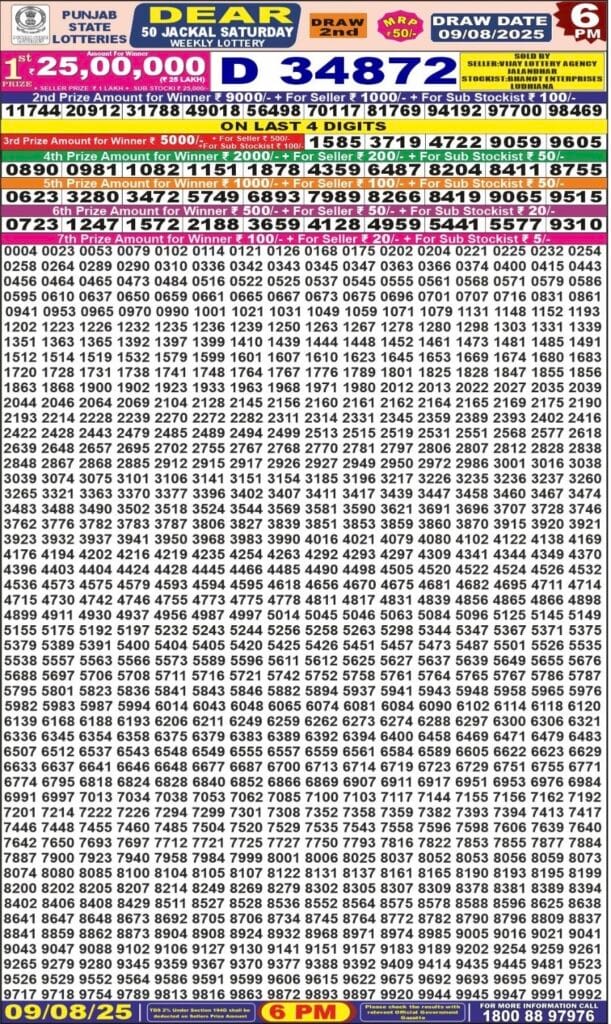 Punjab State Dear 50 Jackal Weekly 9.8.2025 At 6PM 0 Likes 72 Views Related Articles 0 42Maharashtra Ganeshlaxmi Shubh Weekly Draw 04.11.2025 Result 5pm 0 74Dear godavari tuesday Weekly 1pm result 22.07.2025 0 56Punjab State Dear 50 Chief Thursday 6pm Lottery Result 16.10.2025 0 41Punjab State Dear 50 Buster Wednesday 6pm Lottery Result 03.12.2025