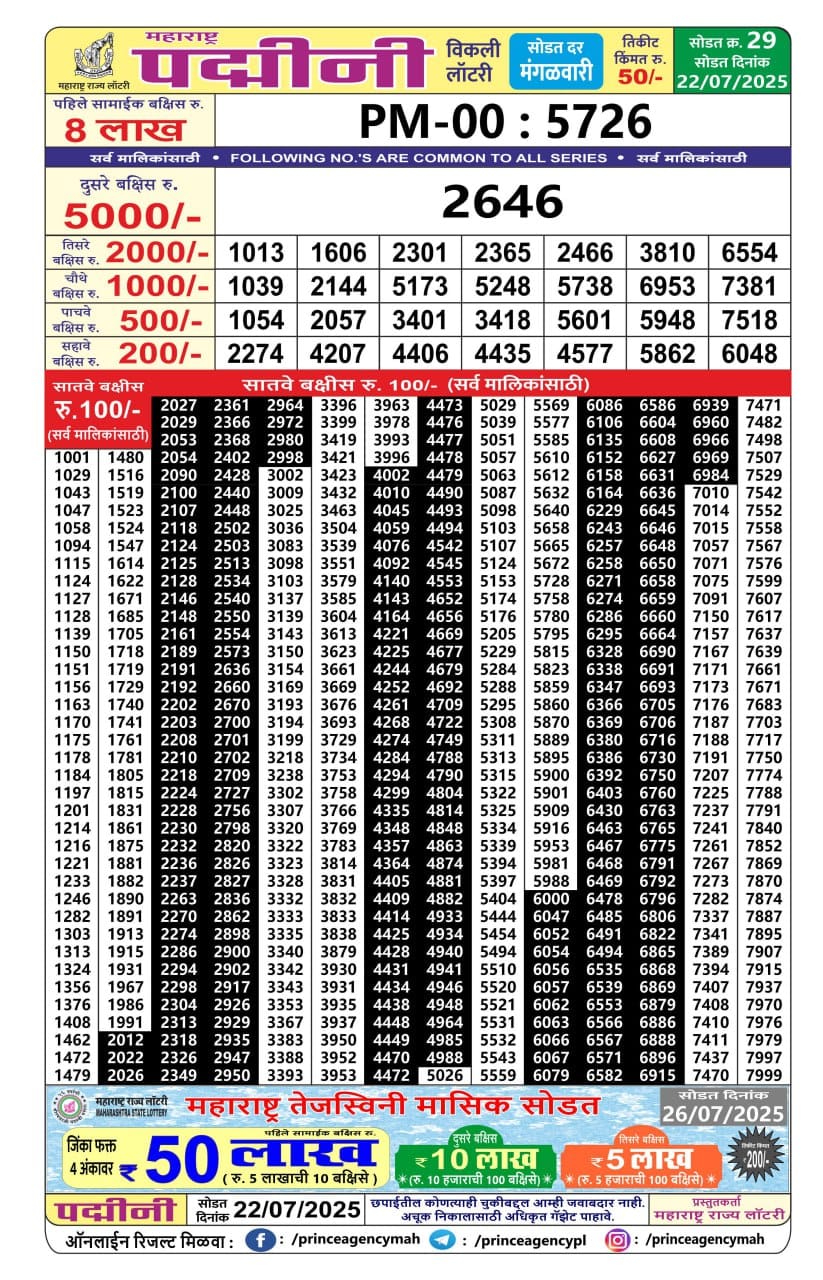 Punjab State Dear 50 Ranger Sunday 6pm Lottery Result 12.10.2025 0 Likes 57 Views Related Articles 0 58Maharashtra Padmini Weekly Draw Result 22.07.2025 0 2Maharashtra Sahyadri Vijayalaxmi Weekly Draw 24.12.2025 Result 4.30pm 0 62Maharashtra Ganeshlaxmi Vaibhav Weekly Draw 23.11.2025 Result 5pm 0 51Punjab State Dear 50 Bronco Tuesday 6pm Lottery Result 02.12.2025
